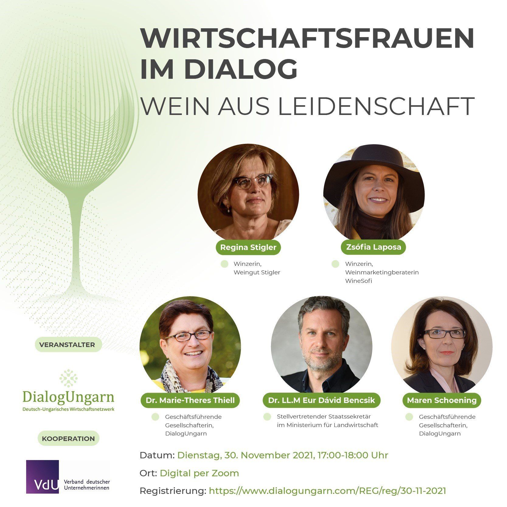 Im Rahmen der Reihe „Wirtschaftsfrauen um Dialog“ von DialogUngarn – in Kooperation mit dem Verband deutscher Unternehmerinnen (VdU) - hatten Marie-Theres Thiell und Maren Schoening zwei spannende Winzerinnen aus Deutschland und Ungarn zu Gast.