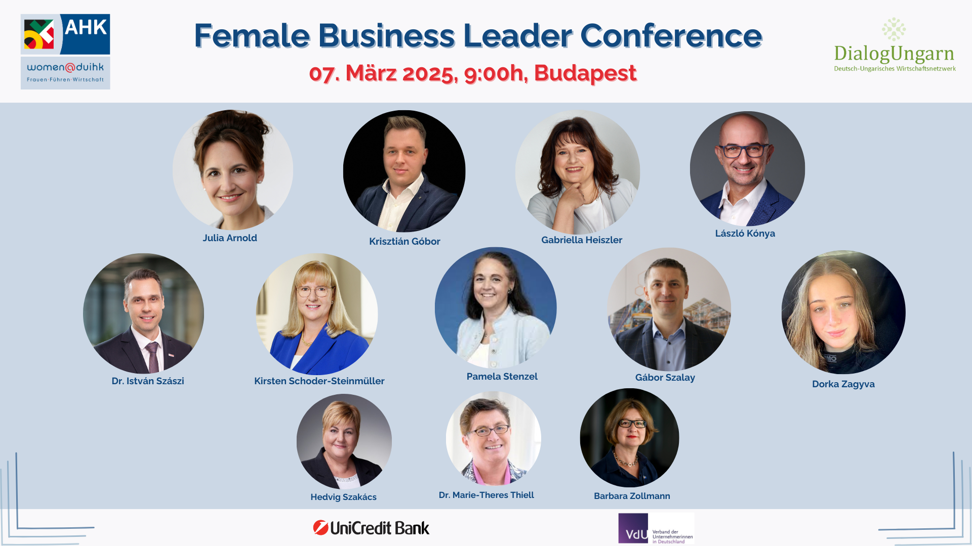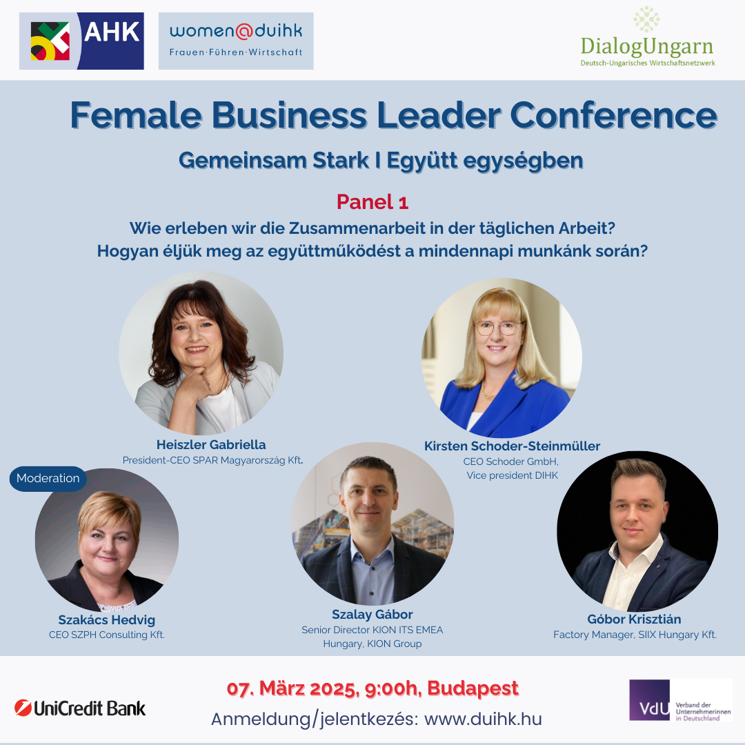 Unter diesem Motto trafen sich mehr mehr als 130 Unternehmer*innen und Führungskäfte - Frauen wie Männer - zur 3. FEMALE BUSINESS LEADER CONFERENCE von DialogUngarn - Deutsch-Ungarisches Wirtschaftsnetzwerk Nonprofit Kft. und der AHK Ungarn - DUIHK - Német-Magyar Ipari és Kereskedelmi Kamara in Kooperation mit dem Verband der Unternehmerinnen aus Anlass des Internationalen Frauentages bei der UniCredit Bank in Budapest.